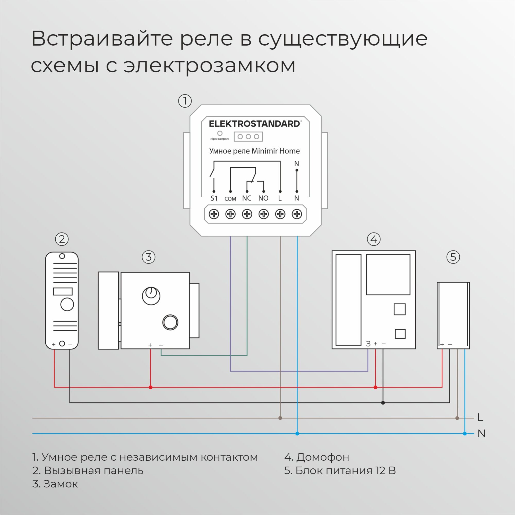 <strong>Реле Умный дом с независимым контактом Elektrostandard</strong> предназначено для дистанционного управления освещением и электроприборами. Независимый контакт позволяет коммутировать любой вид нагрузки, что дает возможность подключать его как к устройствам с напряжением 220 В, так и к низковольтным механизмам, например, к электрозамкам. Может использоваться для управления уличным освещением, электрическими котлами отопления, откатными воротами, насосами для септиков, шлагбаумами, электрозамками и перекрестными схемами управления. <strong>Установка </strong> • Реле может устанавливаться в подрозетник, щиток, на разрыв фазы или в распределительную коробку. <strong>Быстрая настройка </strong> • Работа от сети Wi-Fi 2,4 ГГц обеспечивает быструю настройку без дополнительного оборудования. <strong>Лёгкое управление</strong> • Достаточно один раз настроить сценарий в мобильном приложении Minimir Home. • Управляйте с помощью голосовых помощников Алисы и Маруси. 76010/00 реле Умный дом с независимым контактом